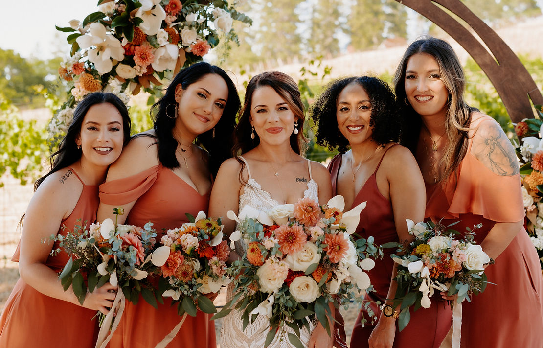 Floral arrangements by The Bouquet Man were a highlight of the day. Vibrant dahlias and roses in shades of coral, pink, and cream perfectly matched the brides and bridal party’s outfits while giant magnolias provided eye-catching pops to the florals on the ceremony arch.